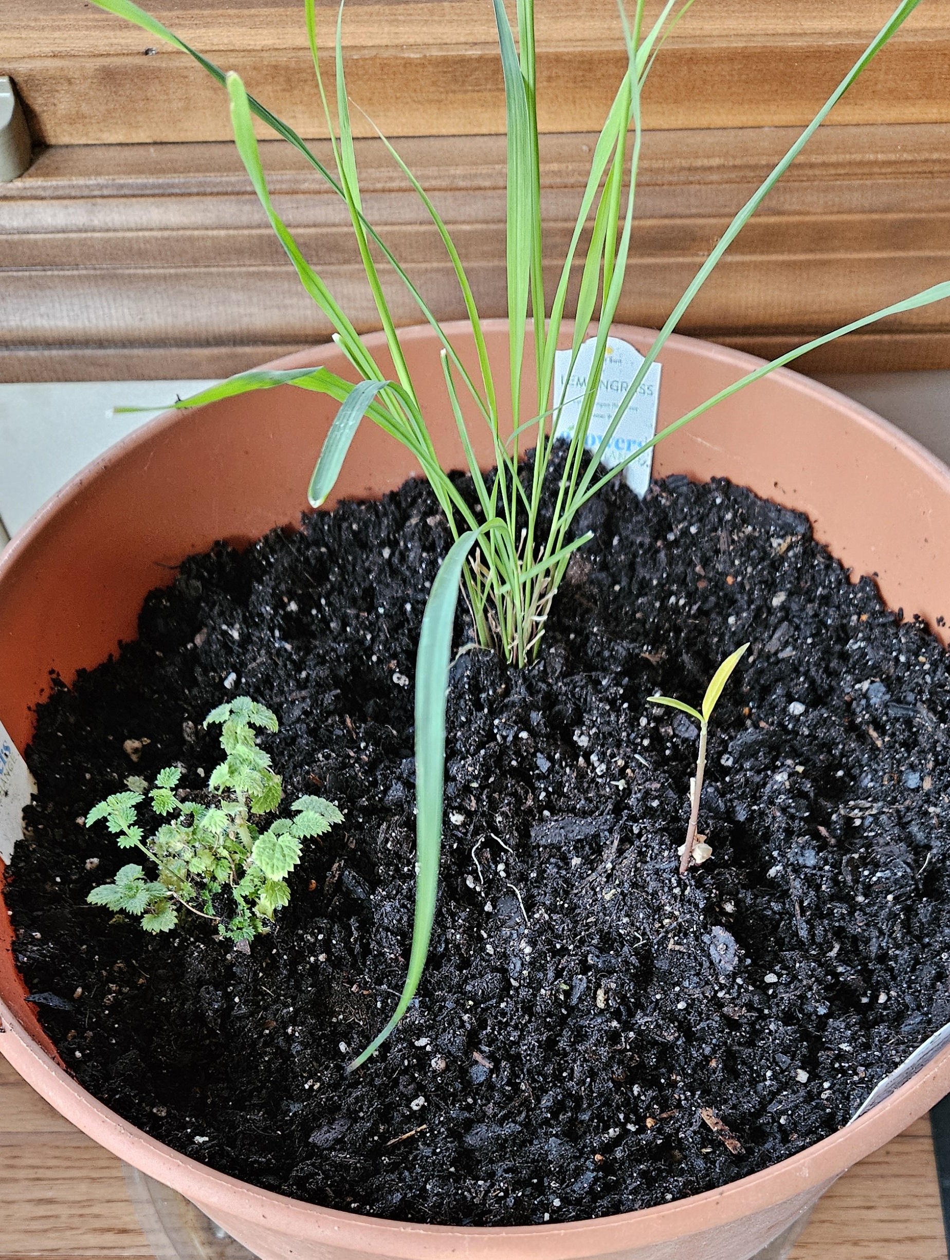 The first potting: Perhaps the beginning of a plant fiber experiment? These are bast-producing plants that can be harvested and spun into a plant based yarn. Perhaps the start of a Bast Garden at Trowes’ Tracks and Hentilagets- who knows? Clockwise from the top: Lemongrass, Swamp Milkweed, Stinging Nettle.