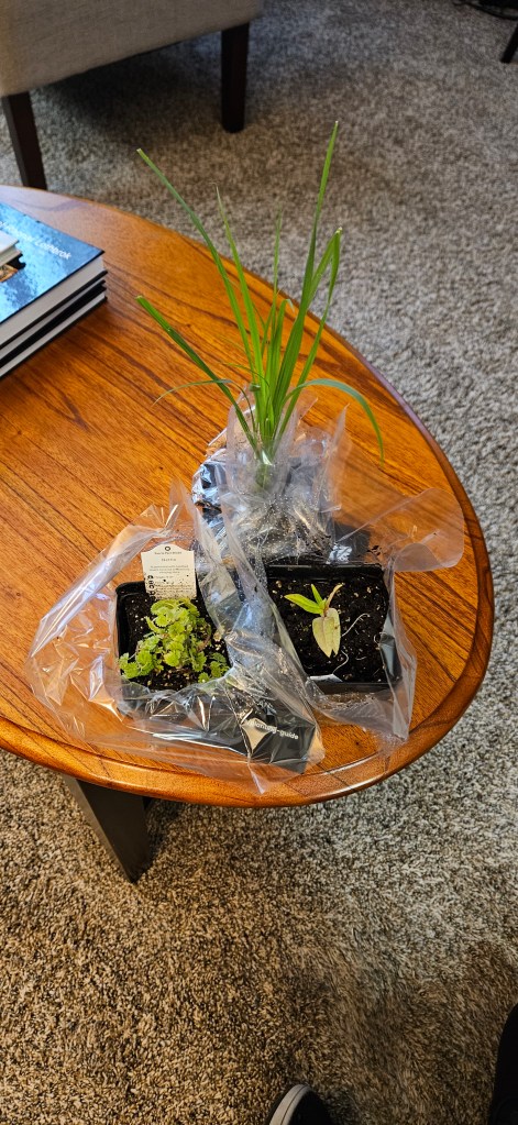 “Bast” plants arrive from Growers Exchange in Virginia for our plant fiber garden: Lemongrass, Nettle, and Swamp Milkweed.